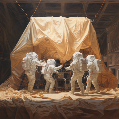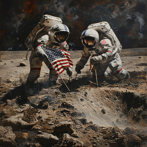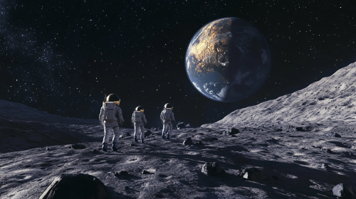 The Moon’s surface with a clear view of Earth in the distance. Astronauts in high-tech lunar suits are engaged in various activities: collecting samples, operating equipment, and exploring the terrain --ar 16:9