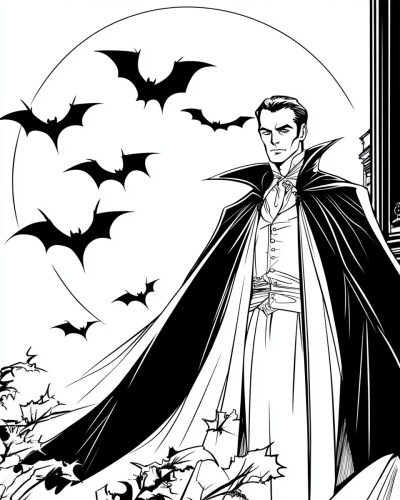Create a Halloween themed coloring page in the style of Patrick Nagel. Create a vintage Hollywood movie Dracula the Vampire with large bats flying in the background with a large full moon. This is a wide shot capture. There is no shading and shadows but only line drawing. --ar 4:5 --v 6.1