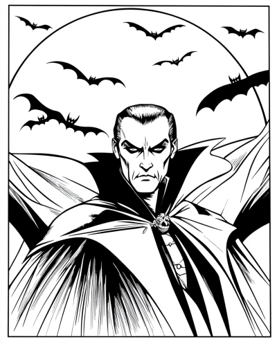 Create a Halloween themed coloring page in the style of Patrick Nagel. Create a vintage Hollywood movie Dracula the Vampire with large bats flying in the background with a large full moon. This is a wide shot capture. --ar 4:5 --v 6.1