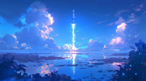 A mighty spaceship blasts off from Cape Canaveral Florida at night, the moon shines bright, there are many stars in the sky, there are fireflies in the air, anime style, high-definition, --ar 16:9 --niji 6