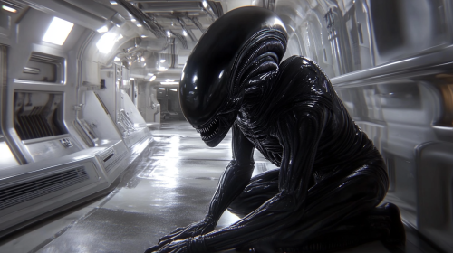 xenomorph from alien, full body shot. animal position. kneeling, hiding in a dark corner of a spaceship. nostromo looking like the first movie alien, in a corridor. cinematic looking, very realistic. --ar 16:9