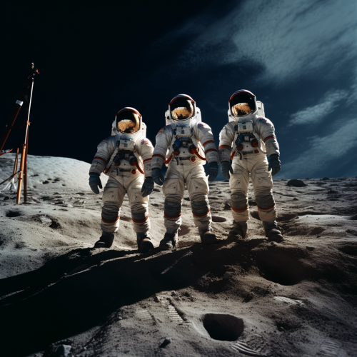 The surface of the Moon, with Earth visible in the background. Astronauts in Nike-branded space suits and lunar boots are exploring the terrain --ar 16:9