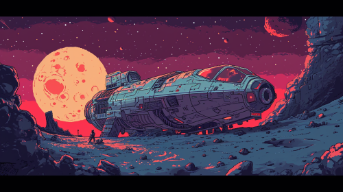 pixel art album cover featuring a cartoonish broken space ship stranded on a moon --ar 16:9 --v 6.0