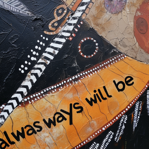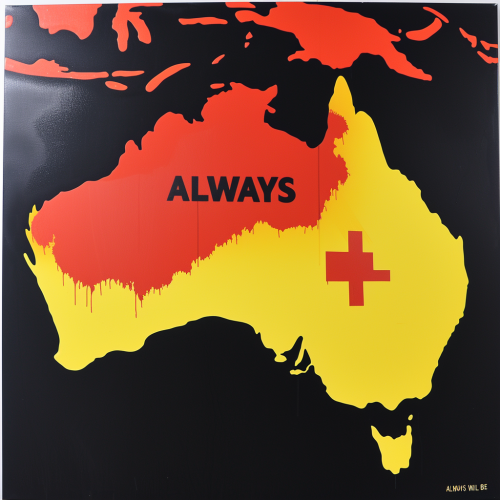 "ALWAYS WAS ALWAYS WILL BE" in the shape of Australia, red, yellow, black --v 6.0 --s 50 --style raw