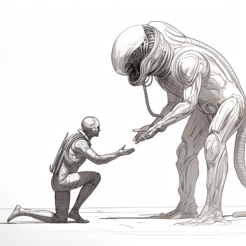 draw, sketch, full body of an astronaut touching an Alien, line work, white background, no shade, low detail, design in pro create