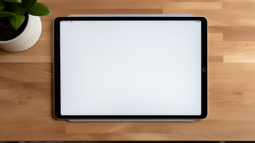 ipad pro tablet, minimilist, close up from above, light wood table background. Canon EOS R5 with RF 50mm f/1.2L USM lens, Resolution 45 megapixels, ISO sensitivity: 100, Shutter speed 1/200 second, photorealistic lighting, Super Resolution, Megapixel, Pro Photo | 8k 80mm, depth of field. Dramatic lighting. --ar 16:9 --style raw --v 5.2
