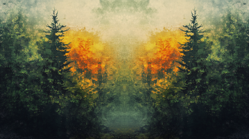 a clearing in the middle of dense green trees with hints of yellow, orange and red leaves just starting to turn colors at the beginning of autumn, shrouded in mist, with a traditional Japanese-style painting. The composition is symmetrical and balanced, using oil paint on canvas to create soft lighting effects and delicate colors. In the background of the deep forest scenery, there's an atmosphere full of mystery. --v 6.1 --ar 16:9