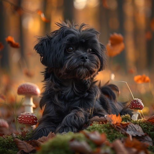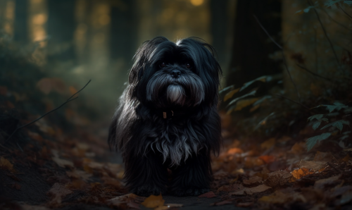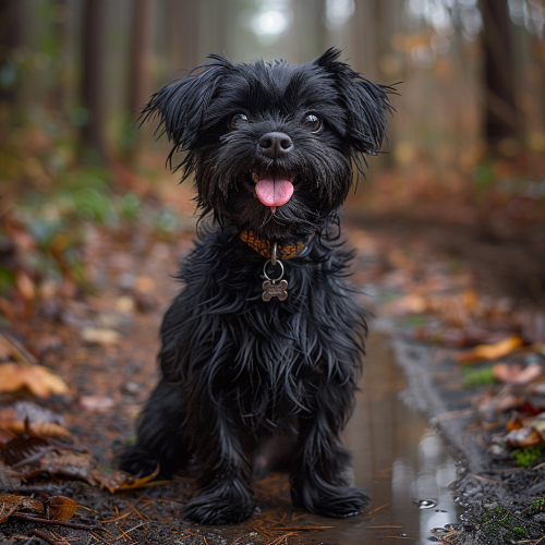 A serene autumnal photograph captures a black shih tzu, likely a Samoyed or similar breed, sitting on a moss-covered dirt path in a dense forest. The dog, positioned centrally, faces the camera with its mouth open, showing its pink tongue, giving an expression of contentment and happiness. It wears a patterned collar with a mix of brown, black, and white, visible around its neck. The foreground features a clear, reflective puddle mirroring the dog's image perfectly, creating a symmetrical composition. The surrounding dirt path is covered with scattered autumn leaves in shades of amber yellow, rust red, and brown, with some small plants and twigs visible. The background consists of tall, slender trees with dark brown trunks, their branches adorned with foliage in warm autumn hues like burnt orange, sienna brown, and golden yellow. Sunlight filters through the canopy, casting a warm glow and creating a soft, golden light that enhances the tranquil mood. The lighting is natural, with a warm white balance, providing a high luminance that highlights the dog and the surrounding environment. The shallow depth of field keeps the focus on the dog while blurring the background, resulting in a dreamy effect with a bokeh effect from the sunlight. The overall color palette includes burnt orange, amber yellow, forest green, charcoal gray, and white, contributing to the cozy and peaceful atmosphere of the scene --s 750 --v 6.0