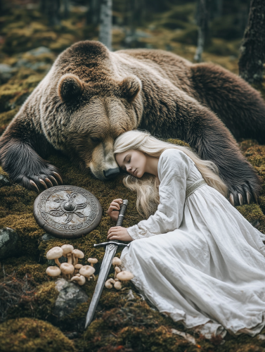 blonde woman with medieval simple white dress lying with giant brown bear on the moss in the autumn forest with moss stones and Psilocybe shrooms all around them , woman should have viking one hand sword in right hand, and viking circular shiled should be further away on teh ground --ar 3:4