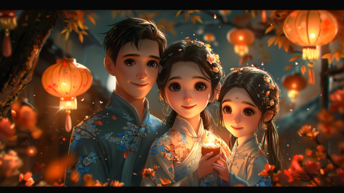 Create a heartwarming scene in a Disney animation style, capturing a joyful family of four--father, mother, son, and daughter--celebrating the Mid-Autumn Festival. The family should be positioned facing the viewer, as if posing for a photograph, with bright, cheerful expressions that radiate happiness. Surround them with traditional Mid-Autumn elements such as colorful lanterns, mooncakes, and a glowing full moon visible through a window in the background. Use vibrant colors and whimsical details to enhance the festive atmosphere, incorporating elements like playful shadows and soft lighting to evoke a sense of warmth and togetherness. The overall composition should be lively and inviting, encapsulating the spirit of family bonding during this special holiday --ar 16:9 --v 6.0 --s 750