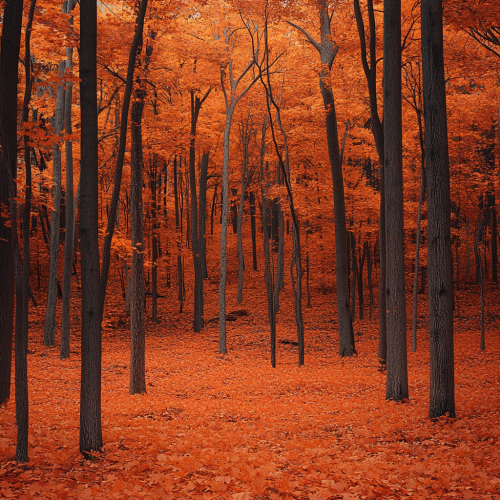A dense maple forest in autumn, the entire scene filled with a vibrant orange hue. The ground is completely blanketed in a thick layer of fallen orange leaves. The maple trees are in full fall foliage, creating a warm, monochromatic landscape. The image has a moody, ethereal atmosphere, with soft, diffused lighting that accentuates the autumnal colors. High detail, photorealistic, 8K resolution, 16:9