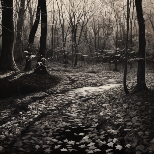 Dynamic, swirling charcoal drawing of falling autumn leaves, high-quality, monochrome, contrasted light and shadows, rhythmic, melancholic, seasonal, nature's ballet :: crisp air, forest floor, October