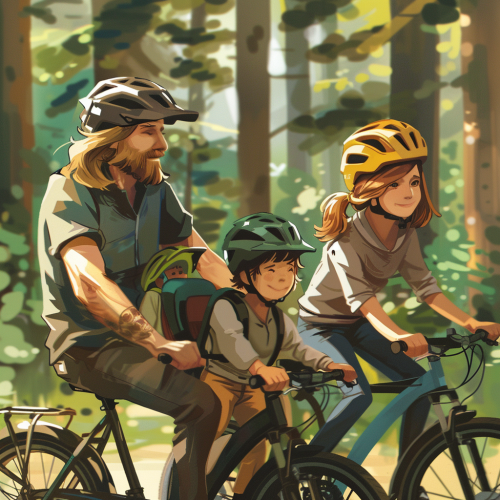 family of four going by bike. The little boy is in a seat on the back of the dads bike. The five year old girl is riding a blue bike. Both kids are wearing green helmets. The dads helmet is black. The moms helmet is dark grey. The dad has long blond straight hair in a ponytail. The mom has brown hair in a ponytail. All look happy in a realistic setting. They’re surrounded by a forest area.