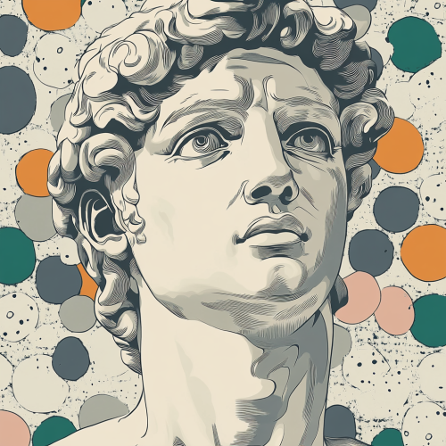 primitive graphic illustrations. plot: plaster head of David and inflatable chewing gum, detailed image with a minimum of details. smooth lines, in the style of Roy Lichtenstein. calm muted colors: blue-gray, green, beige, orange, white. realistic objects. combination of dots and stripes. --v 6.1