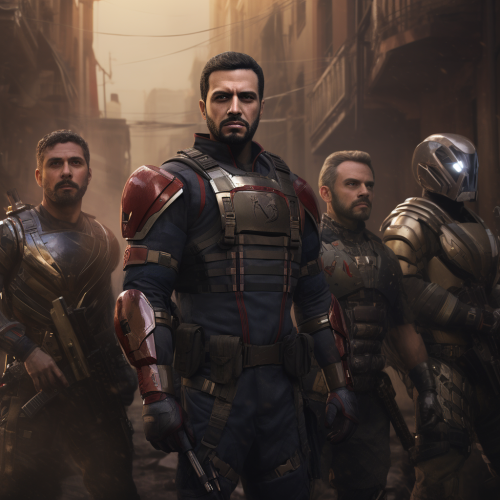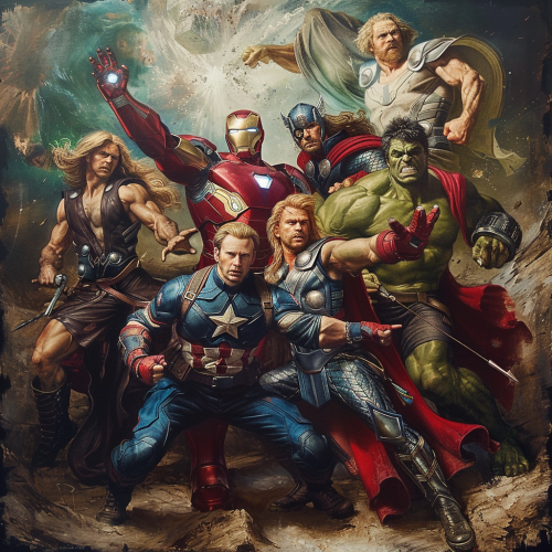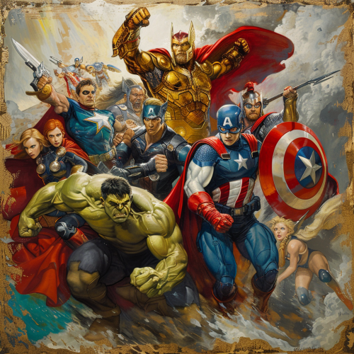 Envision a Baroque masterpiece, echoing the dramatic intensity and emotional depth of artists like Caravaggio or Rubens, where the Marvel Avengers are reimagined as figures of profound drama and complexity. The scene captures Iron Man, Thor, Captain America, Hulk, Black Widow, and Hawkeye, each infused with the characteristic dynamism, tension, and grandeur of the Baroque period. Their poses and expressions convey a narrative filled with action and emotion, set against a backdrop that enhances the drama of the moment. --style raw