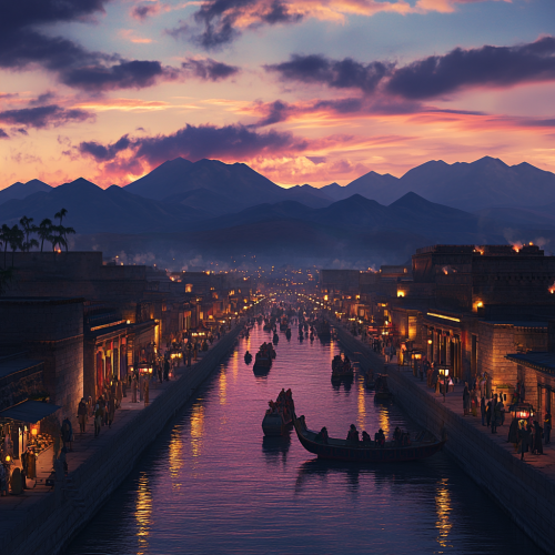 We see a photo realistic image of Aztecs going about their business along both sides of a canal in Tenochtitlán in the early evening. We see the mountains rising in the background against a pink and blue sky during sunset. There are lantern type lights illuminating the canal and surrounding streets of Tenochtitlán.