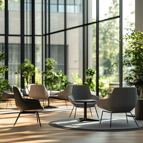 ultra detailed realistic 3D cinematic render - informal meeting area, midcentury modern furniture, sofas, arm chairs, coffee tables, lamps, planting, magazines on tables, art deco archway decals on walls, window behind sofa back wall