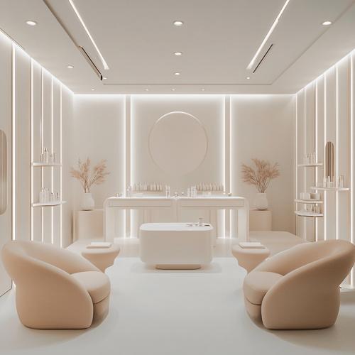 white mimalistic spa room with 2 white simple nail vanity tables in the middle of the room and light pink chairs either side of the tables there are simple walls