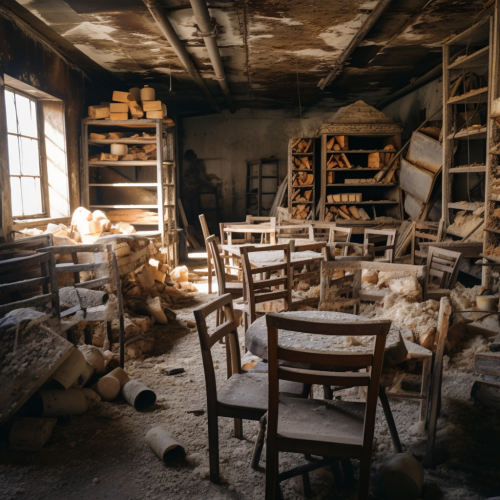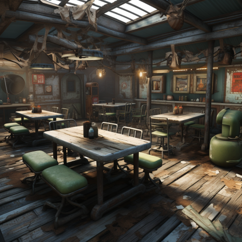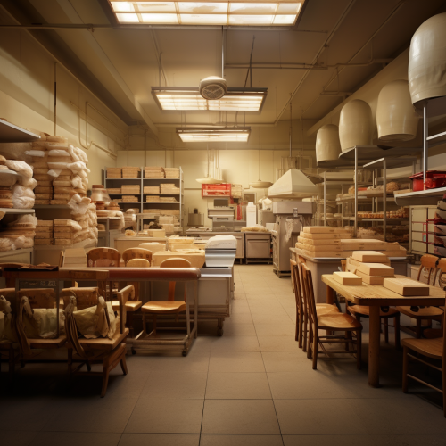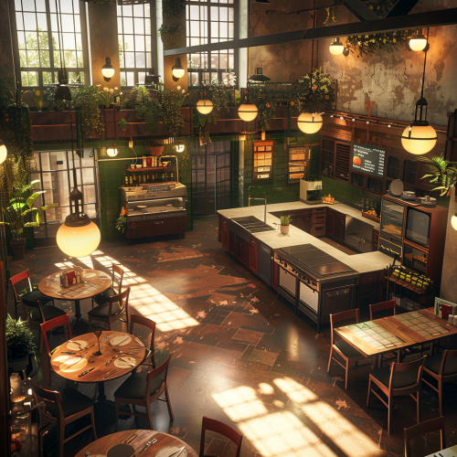 a beautiful cafeteria form far view, of the kitchen with appliances, a isle to pay, 2 tables with chairs, and a bathroom in the side. Real, beautiful, cinematic
