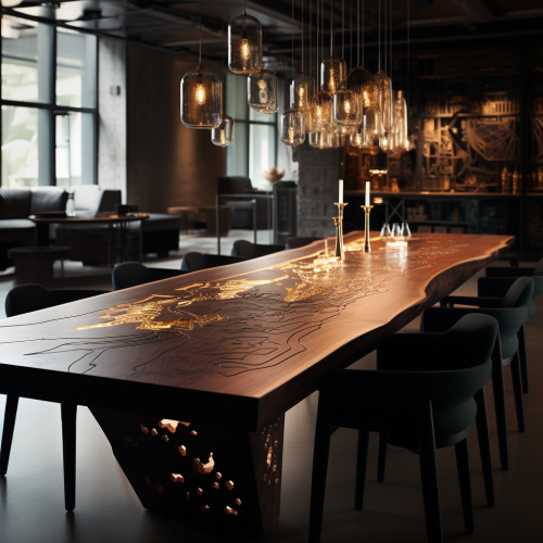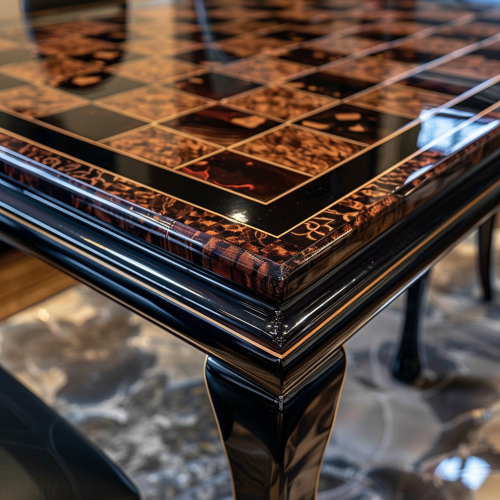 he chess or board game table is a masterpiece, featuring a tabletop coated with a glossy layer of epoxy resin. The surface is perfectly smooth, providing an ideal playing area for various games. The epoxy resin is tinted in a mesmerizing blend of deep mahogany and ebony, creating an elegant and timeless aesthetic. Delicate chessboard squares are meticulously embedded within the epoxy, forming a subtle yet defining pattern. The glossiness of the epoxy enhances the contrast between the squares, making them visually pop. Around the edges of the table, a subtle border is crafted with a metallic finish, adding a touch of sophistication to the design. The legs of the table are sturdy and elegant, complementing the overall aesthetic. The tabletop is spacious enough for chess pieces, cards, or any board game accessories, providing a functional and visually stunning centerpiece for game nights.