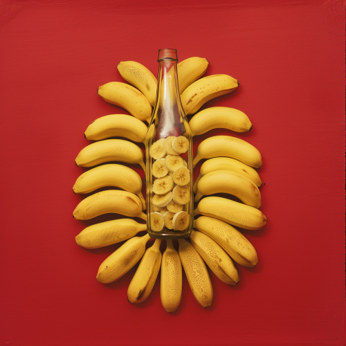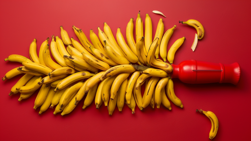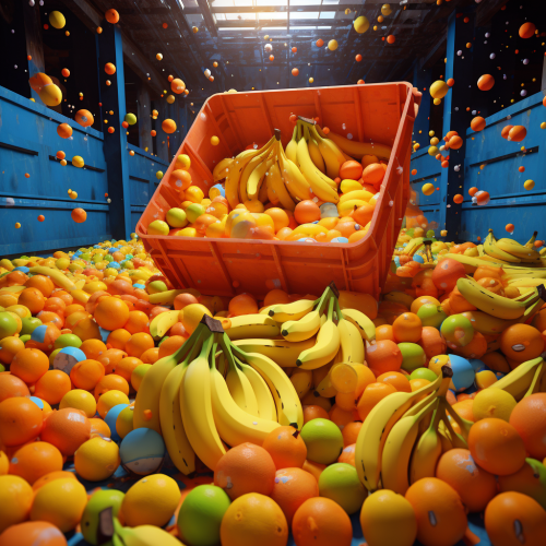 crates bananas, oranges, jawbreakers and eggs falling , vivid colors, vibrant