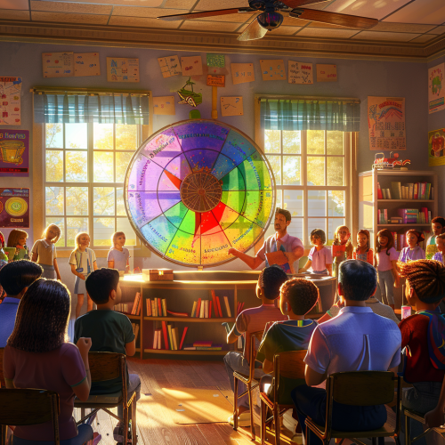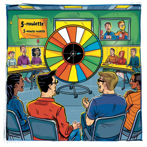 A comic-style illustration of a teacher spinning a colorful "5-minute roulette" in a classroom filled with engaged students. Each section of the roulette displays a different quick activity, bringing energy and excitement back into the room. Bright colors, energetic scene, modern comic style --v 6.0