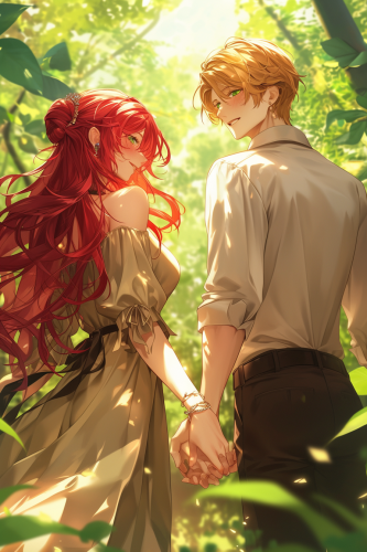 lovers holding hands and turning around in the forest, they are the same height, the girl has long red hair and hazel eyes, the boy has undercut light brown hair on a hair bun and green eyes --ar 2:3 --niji 6