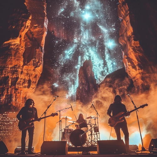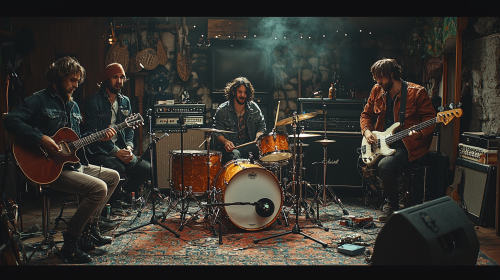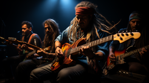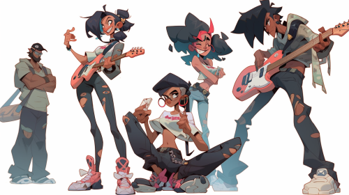rock band, diverse characters, well-drawn, well-rendered faces? full length --ar 16:9 --s 750 --niji 5 --style expressive