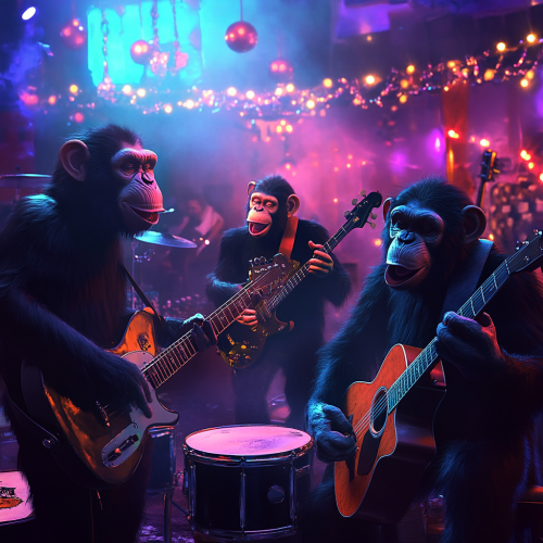 A dramatic action shot of a rock and roll band consisting of 4 cool chimp dudes performing live at a colorful smoky night club bar setting with lots of Halloween themed colors and twinkling lights, an older stocky chimp is playing a drum set, standing next to him is a tall chimp playing an electric Fender Jazz bass guitar with guitar amplifiers behind him while the two handsome and tall chimp dudes in front are playing Martin acoustic guitars and singing into classic looking chrome microphones, all 4 chimp band members must be visible in the picture, highly realistic, high definition, with dramatic lighting and colors