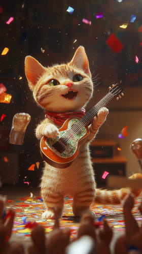 a 3D animated tabby cat playing a tiny guitar, surrounded by cheering mariachi cats, confetti falling, dynamic stage lighting, lively expressions --ar 9:16