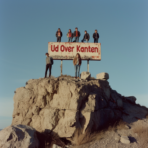 a photo of a band, young people, seen from a distance standing on top of a unnaturally large sign made of rock saying "Ud Over Kanten" --style raw --v 6.0