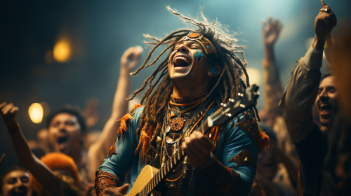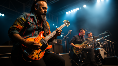 rock concert like indians, 3 indians in band, 3 musicaans like indians, 3 indians band, guitar like indian, drummer like indian, singer like indian, in front audiance, indian band on stage, indian concert at stadium, concert in front of an audience, lot of people, --ar 16:9 --s 750