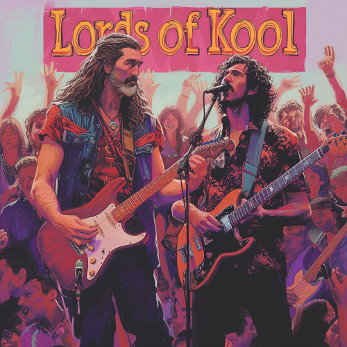 album cover with band name "Lords of Kool" at the top. Two rock gods on the cover. On the left is the tall white God of the electric guitar, clean shaven with long flowing locks. On the right is the Hispanic God of the keyboards and vocals with a buzz cut singing his funk music to the heavens. Fans screaming for them at their feet. --v 6.0