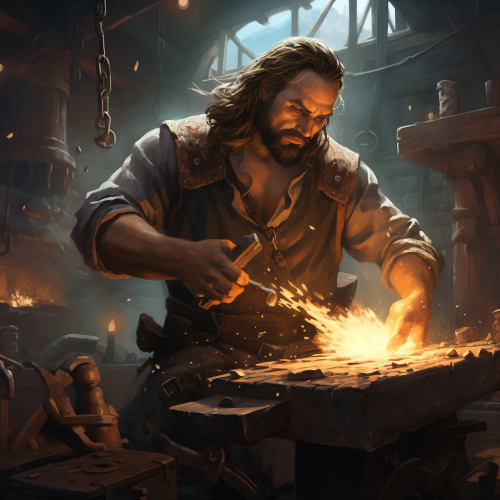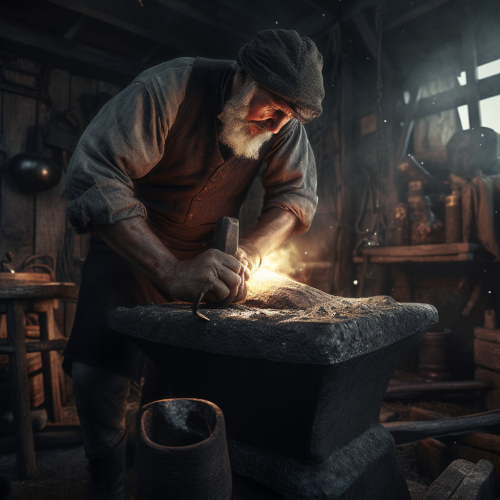 a photorealistic image of a dirty, gritty blacksmith who is hitting a speech bubble on the anvil with his hammer, but the speech bubble is made of steel, and there's a fire kiln burning in the background --v 5.0