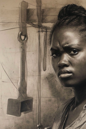 a hand drawn charcoal sketch of a Kenyan woman with short braids, angry face, medieval blacksmith, tool belt, hammer, in a medieval smith shop with furnace --v 6.0 --ar 2:3