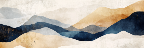 A soft, modern abstract composition featuring organic, flowing shapes and muted tones of beige, taupe, and pale gray with accents of deep indigo and warm, muted gold. The design should evoke a sense of calm, balance, and understated luxury, with subtle texture variations and gradient transitions. The artwork should maintain a minimalist style while hinting at natural elements like clouds or waves, creating a peaceful, contemporary atmosphere --ar 3:1