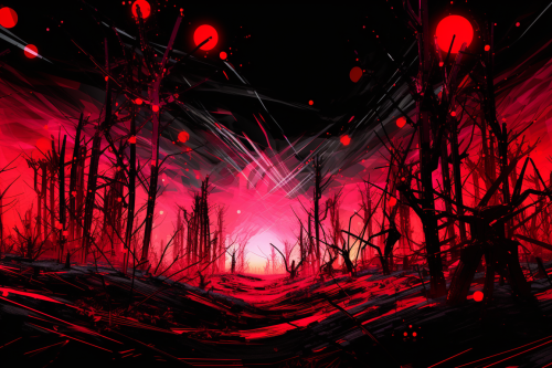 in Jean-Michel Basquiat style fractal chaos energy, neon colored. red space trees --ar 3:2 --v 5.2