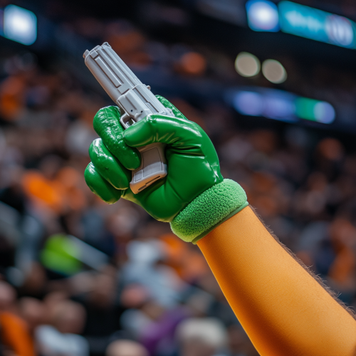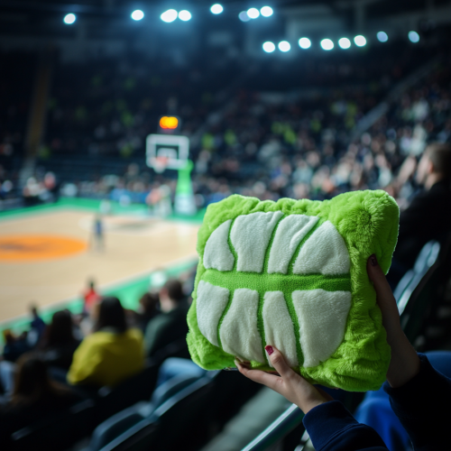 Arena, krepšinio varžybos, krepšinio aistruolis, laikantis didelę didelę pagalvėlę pirštinę ištiestu pirštu. 631 / 5 000 Arena, basketball game, basketball fan holding big big cushion glove with outstretched finger. cushion glove colors are white and green, semi-blurred background, mockup, Full HD, high resolution, shot with Canon EOS R5 F1.2 ISO 100 80mm
