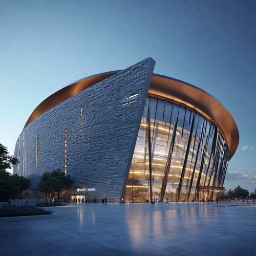 create architectural rendering of sports arena at dusk. Design to have blade like metal roof that come to pointed edge. Underside of roof has linear lights in concentric arrangement. Roof is held up by large stone walls with slit openings that light pores out of. Large opening for glass atrium with light coming out. Contemporary design. Slightly futuristic.