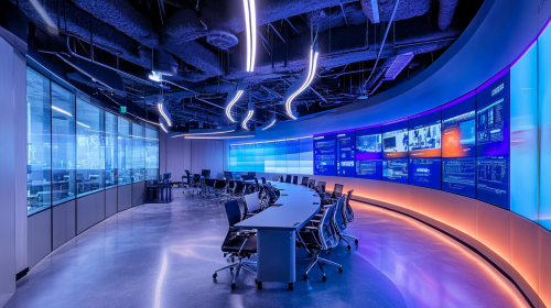 Futuristic Innovation Lab with high-tech classrooms, common study area, VR arena, and public engagement space. The classrooms have giant touchscreens and interactive smart boards on the walls, ergonomic seating, and smart desks with touch panels. The common study area includes wellness pods with calming visuals and soft ambient lighting, dynamic lighting systems, and soundscapes designed to improve focus. The VR arena is a 200-square-meter flexible space with movable walls, full 360-degree projection mapping, and immersive virtual environments. A spacious public area showcases interactive exhibits and VR experiences related to police technology. The design is sleek, modern, with metallic accents, glass partitions, and futuristic lighting. --ar 16:9