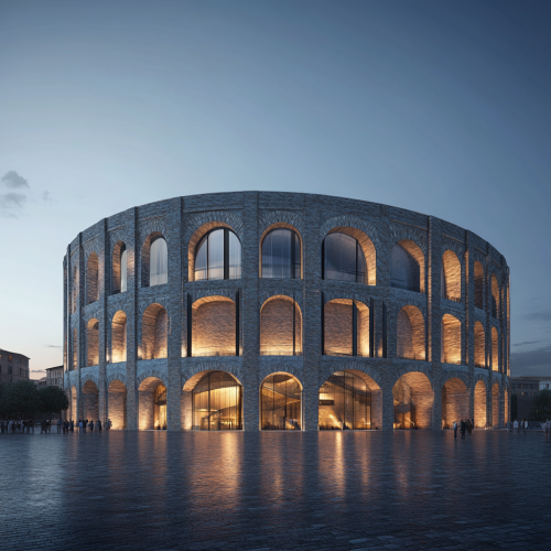 architectural rendering of arena that is inspired by roman colosseum. Contemporary design using brick facade with glass windows. Dusk rendering with glowing light from interior of arena. High energy. Modern parametric facade