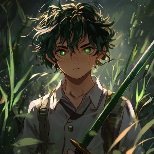 Anime style art, young teenage male character with pale green eyes, blades of grass for hair, freckles, looks nervous, and wearing school uniform, grass sword in his hand, arena background, hair is made of grass