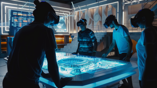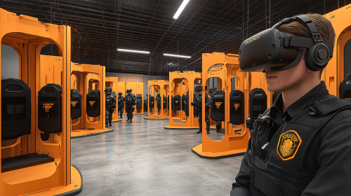 rendering a virtual reality arena used to train police office. props and elements to be used as obstacle and architectural elements are movable to create new layout of the arena. floor, walls and props are alle of the same material. police officers wearing vr headset and a black uniform are training. --style raw --v 6.1 --ar 16:9 --c 12 --s 400 --no text