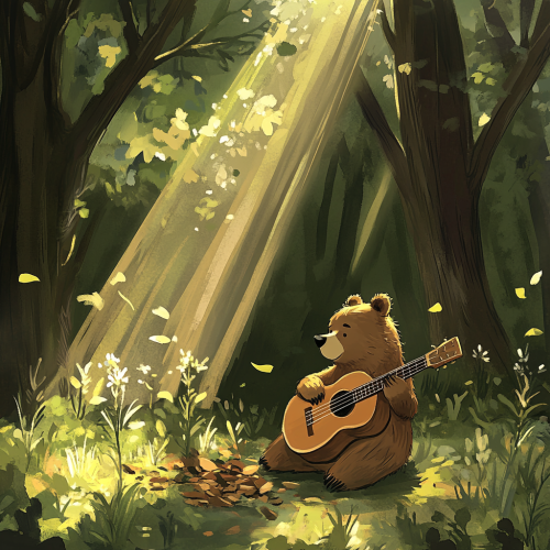 In a lush, green forest, Jonny the brown bear discovers a broken guitar half-buried under a pile of leaves. Jonny, with a curious and excited expression, Sunlight filters through the trees, casting gentle rays on Jonny and the guitar. The scene is serene, yet magical, as Jonny begins to imagine the possibilities. in the woods in the style of Hayao Miyazaki and Eiichiro Oda, watercolor.