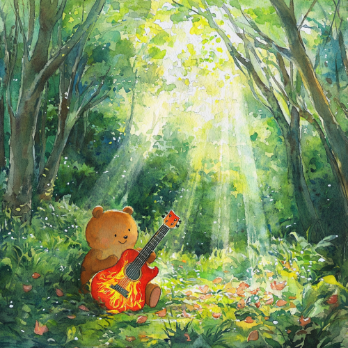 In a lush, green forest, Jonny the brown bear sees a broken red and flame painted electricalguitar hidden under a pile of leaves. Sunlight filters through the trees, casting gentle rays on the guitar. The scene is serene, yet magical, as Jonny begins to imagine the possibilities. in the woods in the style of Hayao Miyazaki and Eiichiro Oda, watercolor
