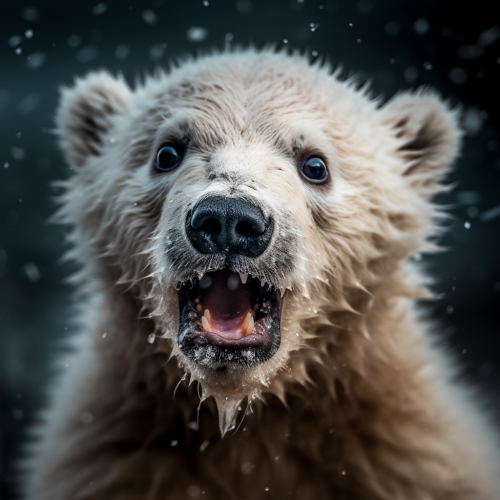 Young polar bear cub with exaggerated shocked expression, dropping a silver fish mid-bite, macro photography capturing every detail of fur and expression, dramatic side lighting, snowflakes in the air, arctic blue background, ultra-sharp focus --ar 1:1 --v 5.0 --stylize 1000