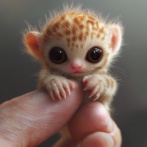 Create a hyper-realistic image of a tiny baby animal. The animal is incredibly small, with soft, spotted fur and large, curious eyes. It holds onto the thumb with its tiny, delicate hooves. The scene is closely focused on the baby animal, highlighting its adorable features and long eyelashes.