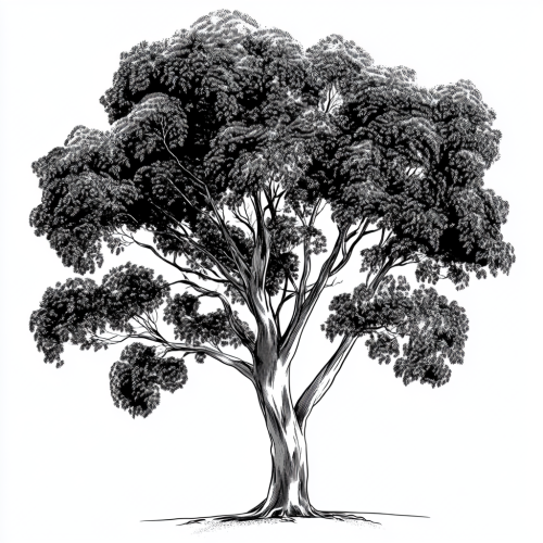 An detailed Australian Spotted Gum tree with a bold, thick trunk, featuring smooth, woodcut-style shading. The tree has a tall, sturdy trunk with smooth, mottled bark characteristic of a Spotted Gum, with branches spreading symmetrically. The leaves are depicted with fine line work for texture and detail. Use highlights and shadows to create depth and a dramatic contrast, in the style of vintage barbershop or tattoo illustrations. The background should be completely white, with the tree in a monochromatic, high-contrast, linocut or engraving style.