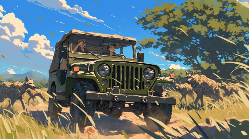 an old green jeep drives past a pack of wild african spotted dogs while on safari in the Sudanese brush, high-definition, anime-style, --ar 16:9 --niji 6