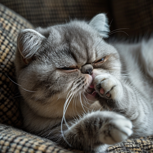 exotic shorthair, grey and white hairs, licking her foot --v 6.0